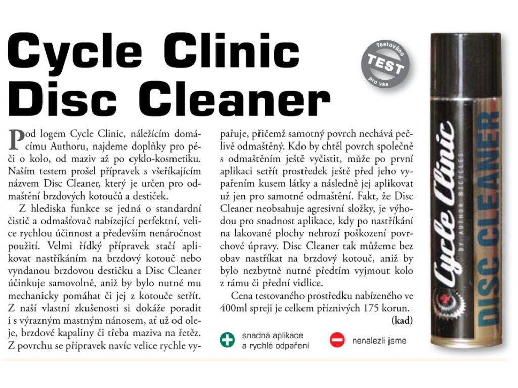 CYCLE CLINIC DISC CLEANER je profesionální čistič určený především pro brzdové kotouče jízdních kol. Díky rychlému a dokonalému odstranění prachu, mastnoty a ostatních nečistot z kotoučů se zlepší účinnost brzd. Čistič se rychle odpařuje a nezanechává jakékoliv zbytky nečistot. Je šetrný pro pryž, plast, eloxované kovy, karbon a povrchové laky.