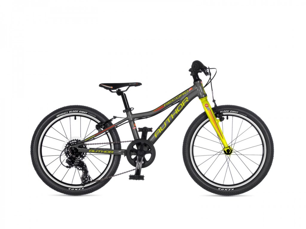 Dětské Kolo Author Record 20" šedá/limeta/červená. Lehký hliníkový rám spolu s kevlarovými plášti Kenda small block dává kolu super váhu 8.3kg. Převody obstárává "7dmi kolo"(1x7), takže rychlost z kopce nebo do kopce nebude nikdy problém. modelový ROK 2025.